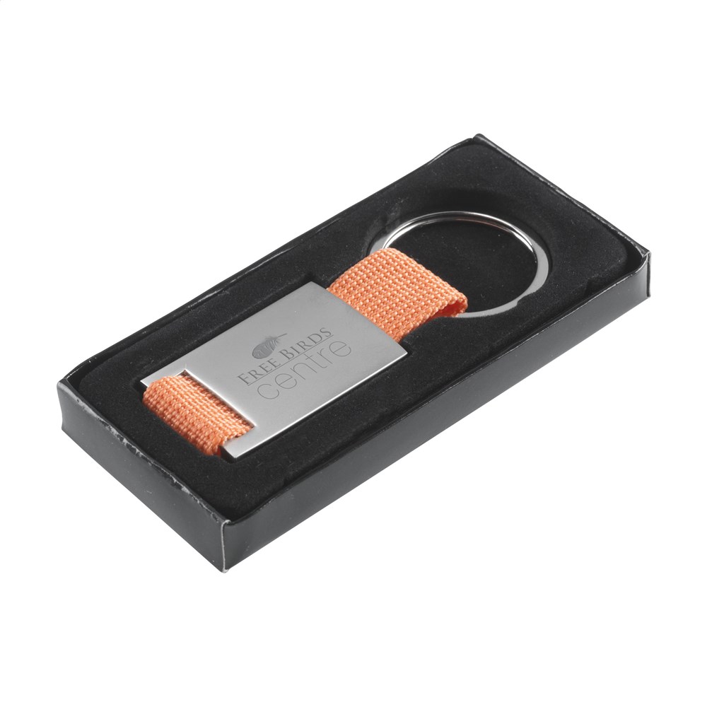 Matmetalen sleutelhanger gecombineerd met sterk geweven nylon aan stevige sleutelring. Per stuk in doosje.