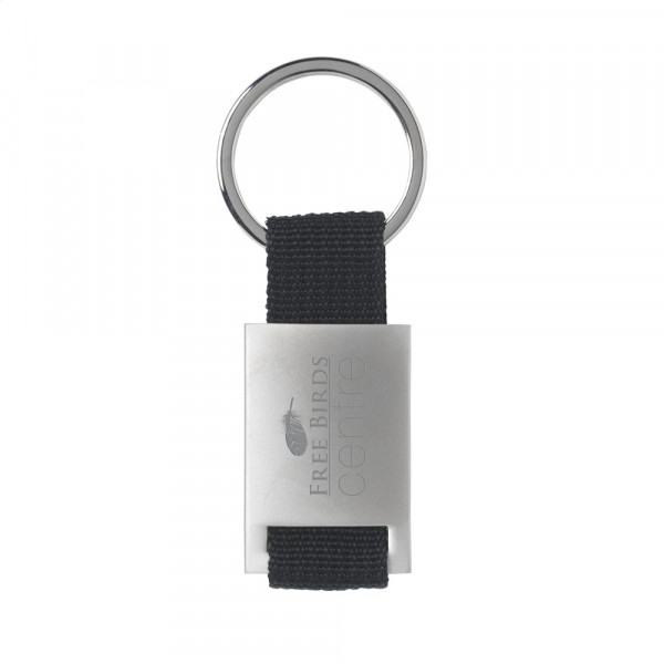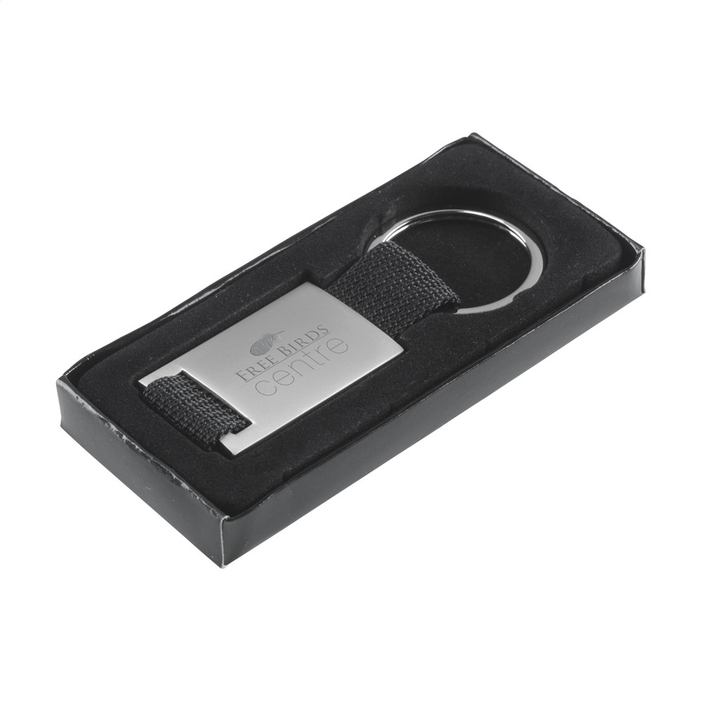 Matmetalen sleutelhanger gecombineerd met sterk geweven nylon aan stevige sleutelring. Per stuk in doosje.