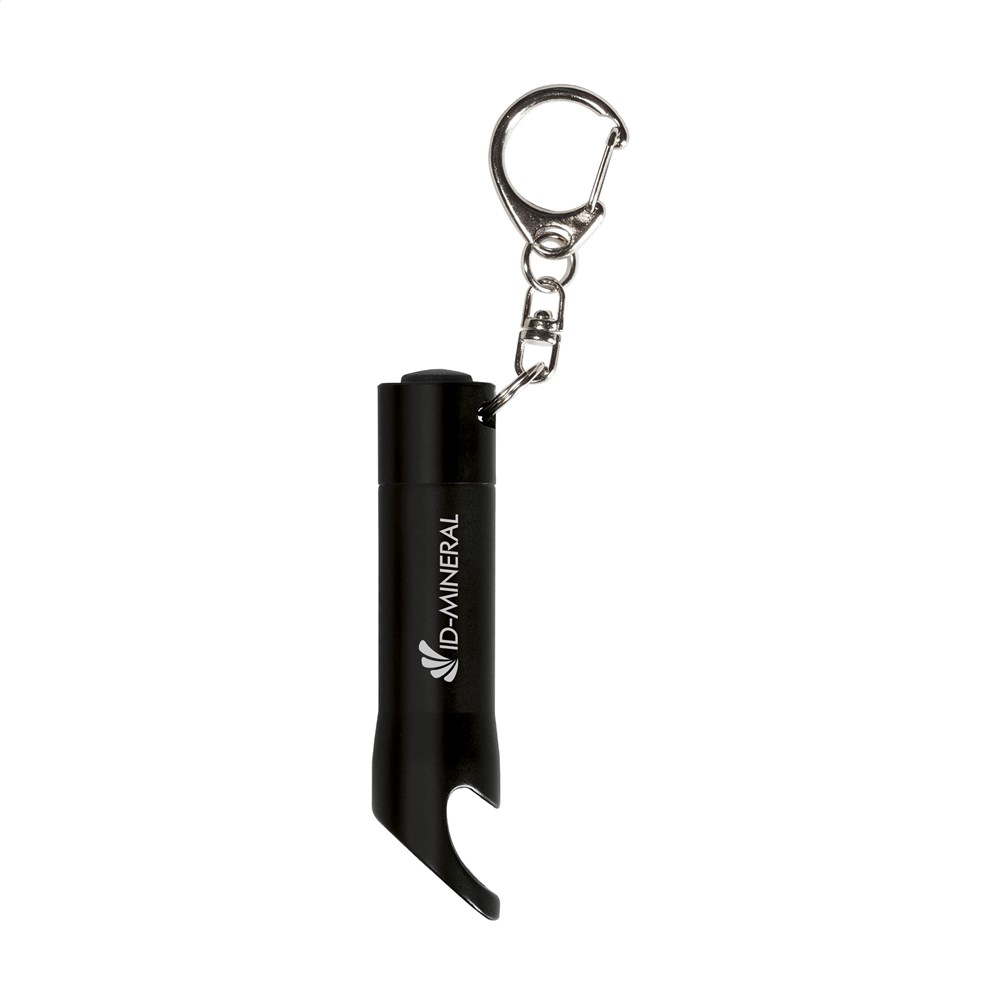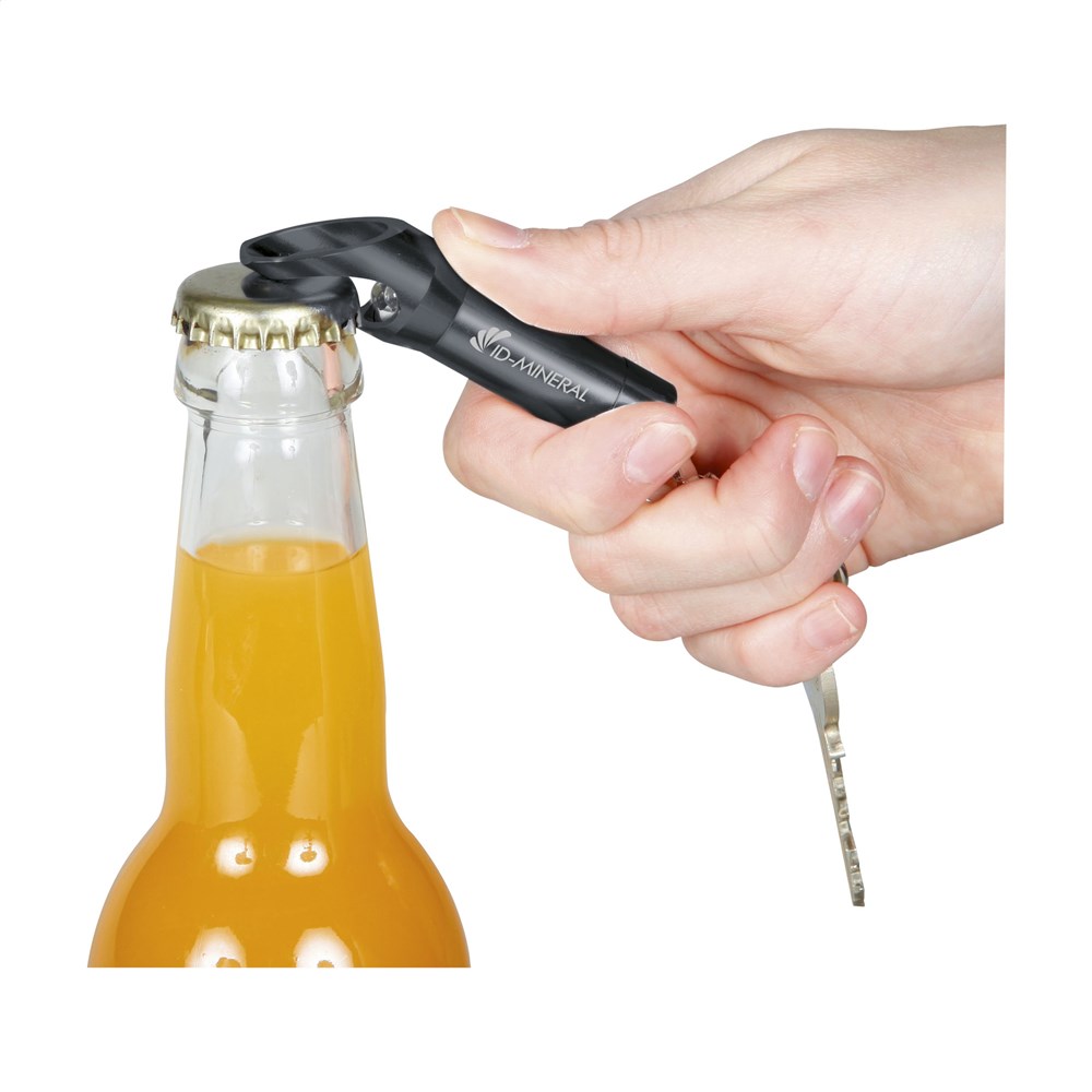 Aluminium staaflampje met 3 felwitte, energiezuinige LED-lampjes en flesopener. Aan karabijnhaak. Incl. celbatterijen. Per stuk in doosje.