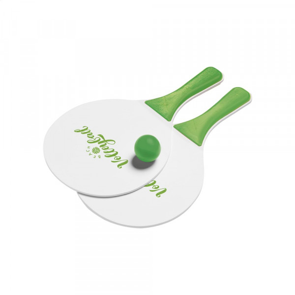 Sportieve strandset: 2 houten rackets en een rubber balletje.
