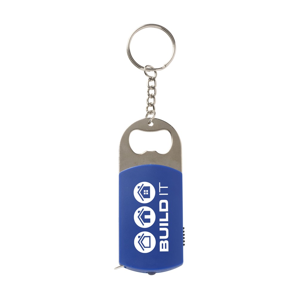 Multifunctionele sleutelhanger met stevige sleutelring, flesopener, energiezuinig LED-lampje en rolmaat met aanduiding in inches en centimeters (lengte 100 cm). Incl. celbatterijen.