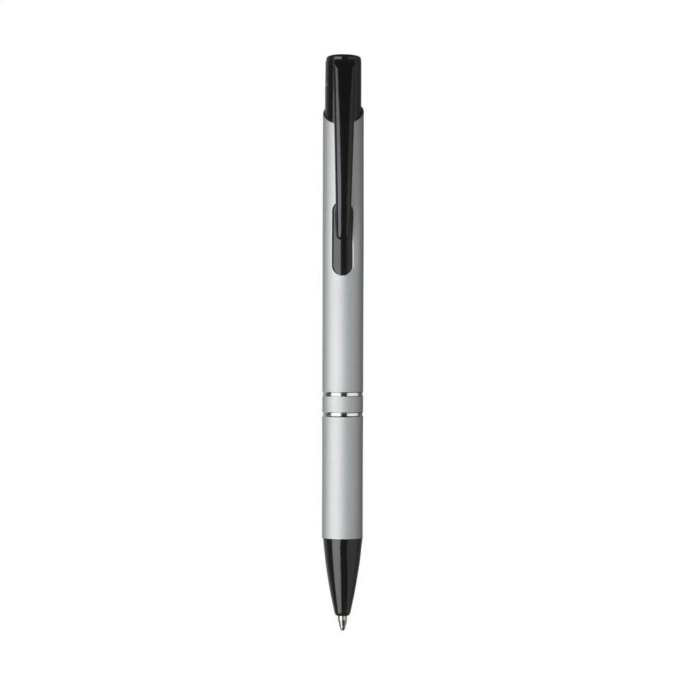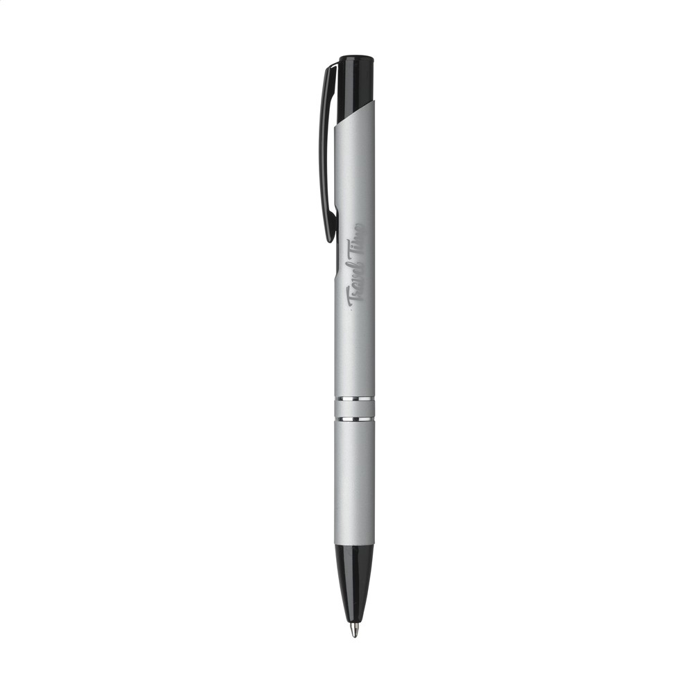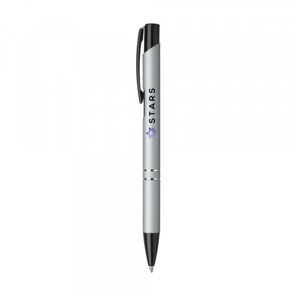 Blauwschrijvende balpen met zwart gelakte drukknop/clip en puntstuk, chrome tussenringen. De houder is afgewerkt met een mooie rubberized finish.