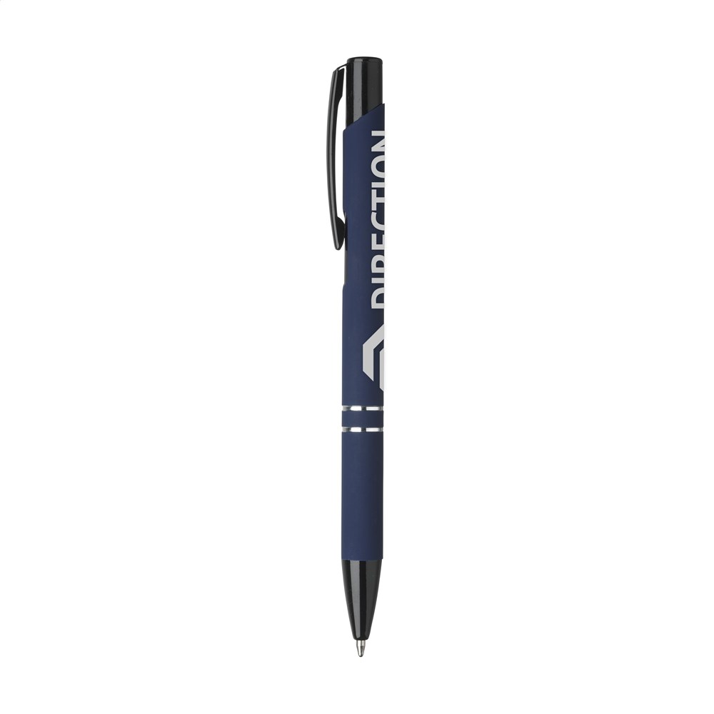 Blauwschrijvende balpen met zwart gelakte drukknop/clip en puntstuk, chrome tussenringen. De houder is afgewerkt met een mooie rubberized finish.