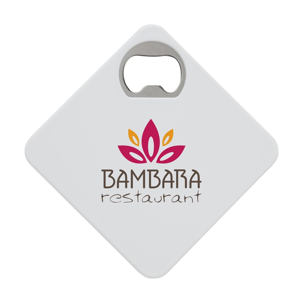 Onderzetter en metalen opener ineen. Met slipvaste onderzijde. Ook te bedrukken met je eigen foto, logo of zelfontworpen design in full colour. Zeer geschikt om te verzenden met een direct mail.