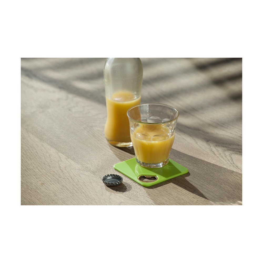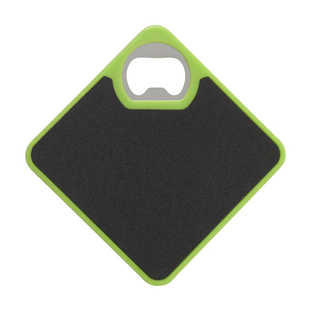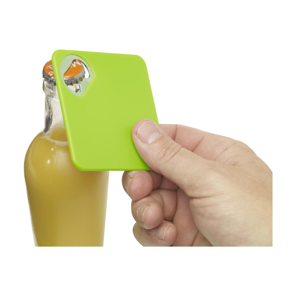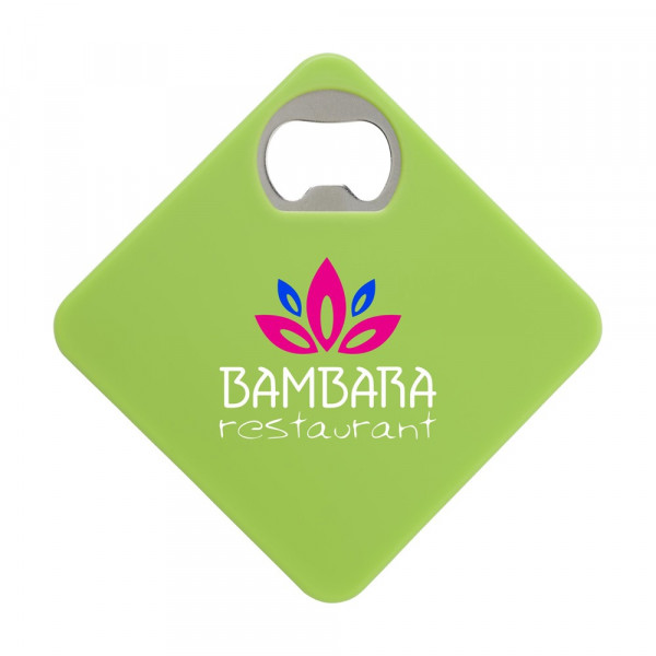 Onderzetter en metalen opener ineen. Met slipvaste onderzijde. Ook te bedrukken met je eigen foto, logo of zelfontworpen design in full colour. Zeer geschikt om te verzenden met een direct mail.