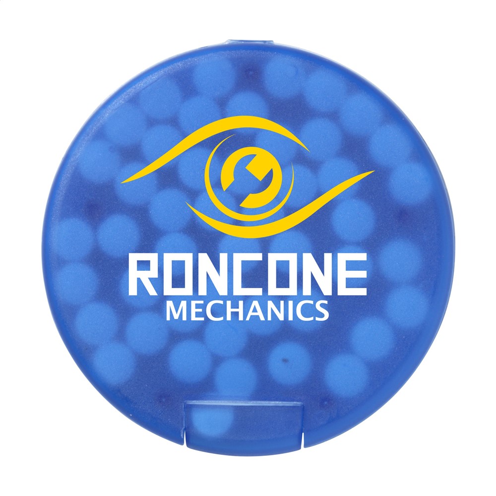 Ronde, kunststof dispenser gevuld met ca. 12 gram (ca. 55 stuks) frisse, suikervrije pepermuntjes.