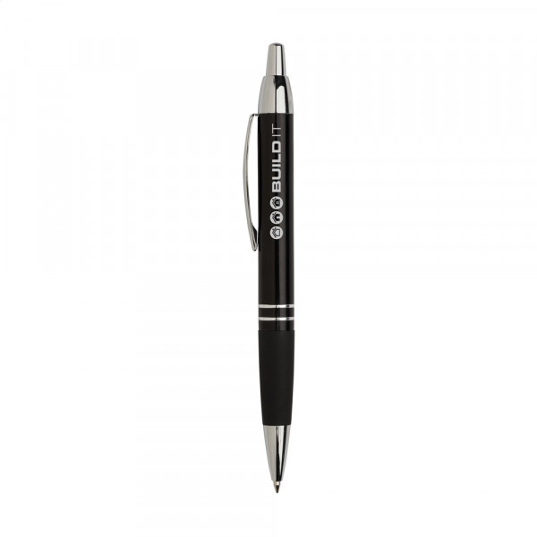 Blauwschrijvende, metalen balpen met hoogglans metallic look houder, gripvast, rubberen voorstuk, stevige, metalen clip en drukknop en zilverkleurige hoogglans accenten. Geef uw geschenk meer karakter met één van onze stijlvolle geschenkverpakkingen.