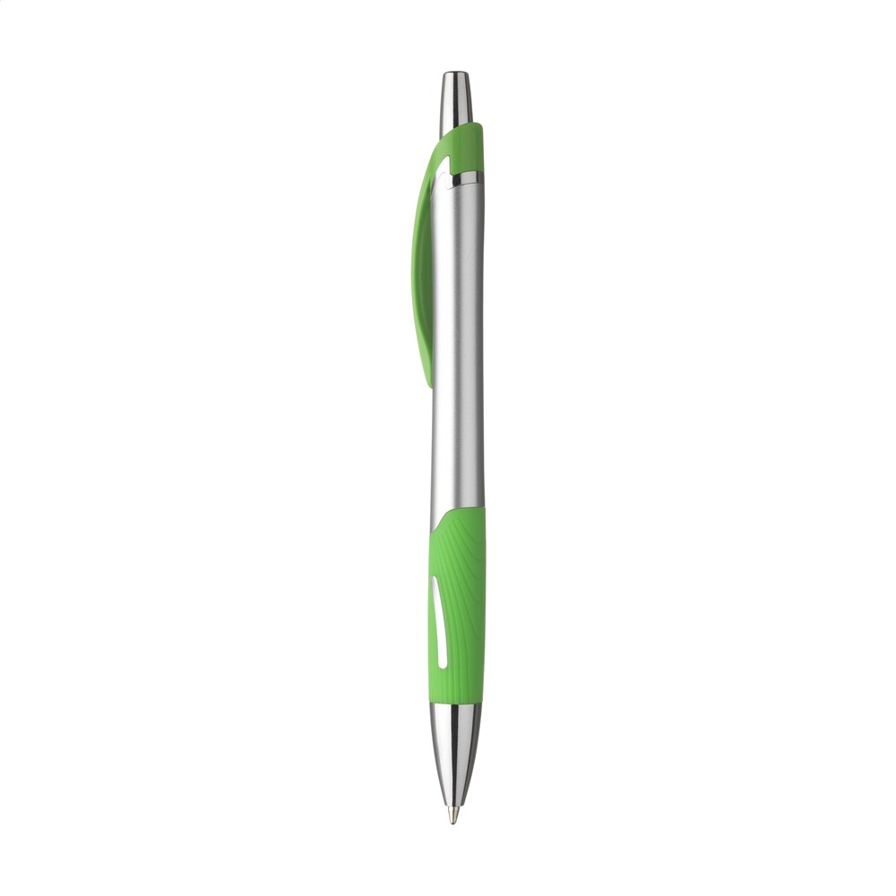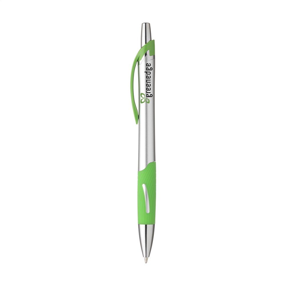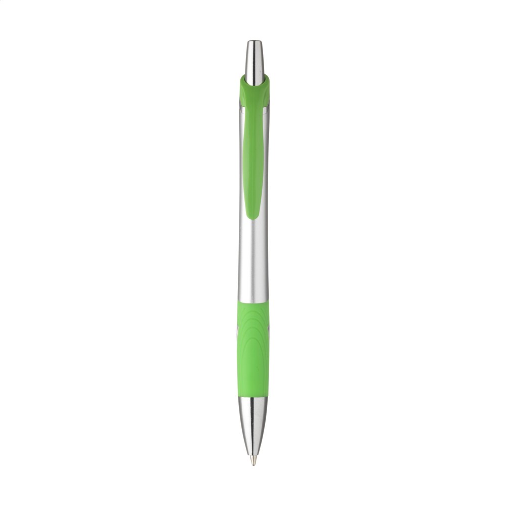 Blauwschrijvende balpen, uitgevoerd in een combinatie van mat en hoogglans kunststof. Met gripvast, rubberen voorstuk en opvallende accenten.