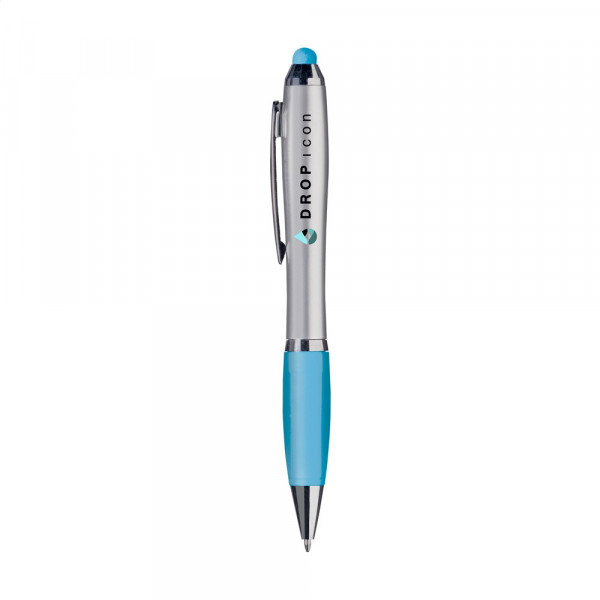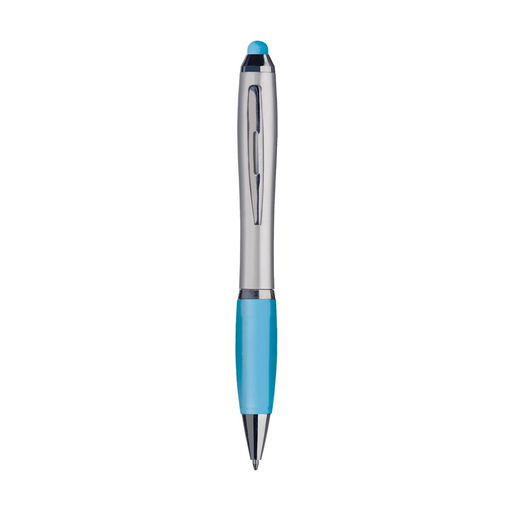 Blauwschrijvende balpen met gekleurde, rubberen top/pointer voor het bedienen van touchscreens (zoals iPhone/iPad). Voorzien van hoogglans accenten, gekleurd, gripvast voorstuk, uitsparing in metalen clip en draaikliksysteem.
