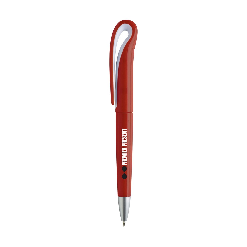 Blauwschrijvende balpen met fraai gebogen clip met wit-accent en draaikliksysteem.