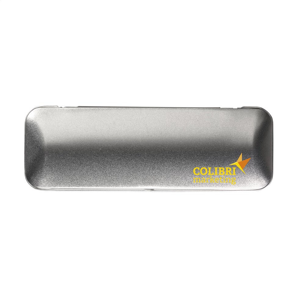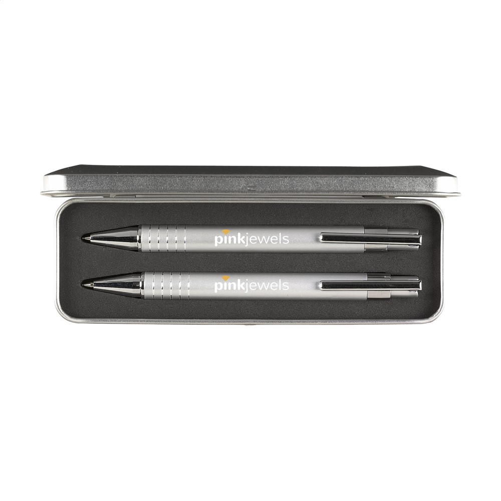 Metalen schrijfset: blauwschrijvende balpen en vulpotlood met 3 HB vullingen (0,7 mm). Beide met hoogglans laklaag. In geschenkblik. Per set in doosje.