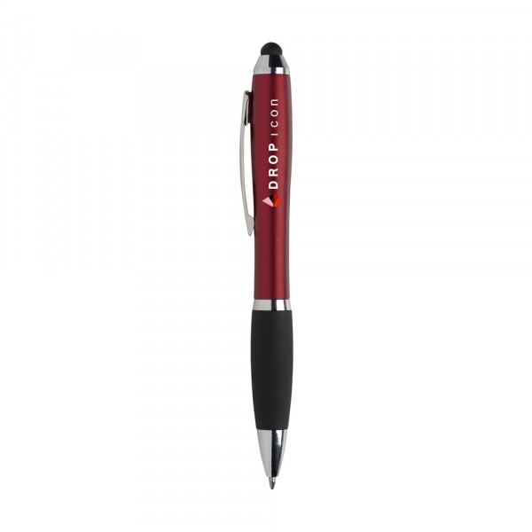 Blauwschrijvende balpen met houder in metallic look, gripvast, rubberen voorstuk, hoogglans accenten, uitsparing in metalen clip, rubberen top/pointer voor het bedienen van touchscreens (zoals iPhone/iPad).