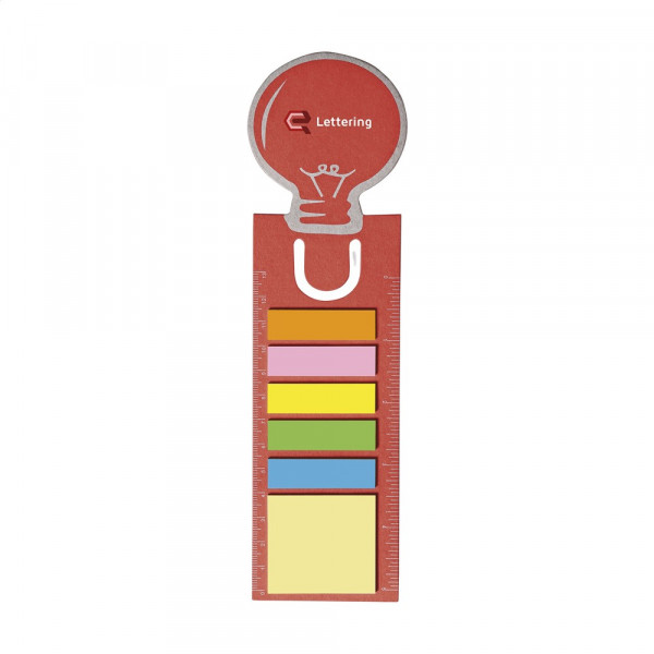 Boekenlegger van stevig karton met 15 zelfklevende memovelletjes, 75 beschrijfbare markeerstickers en liniaal (lengte 13 cm/5 inches).