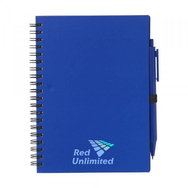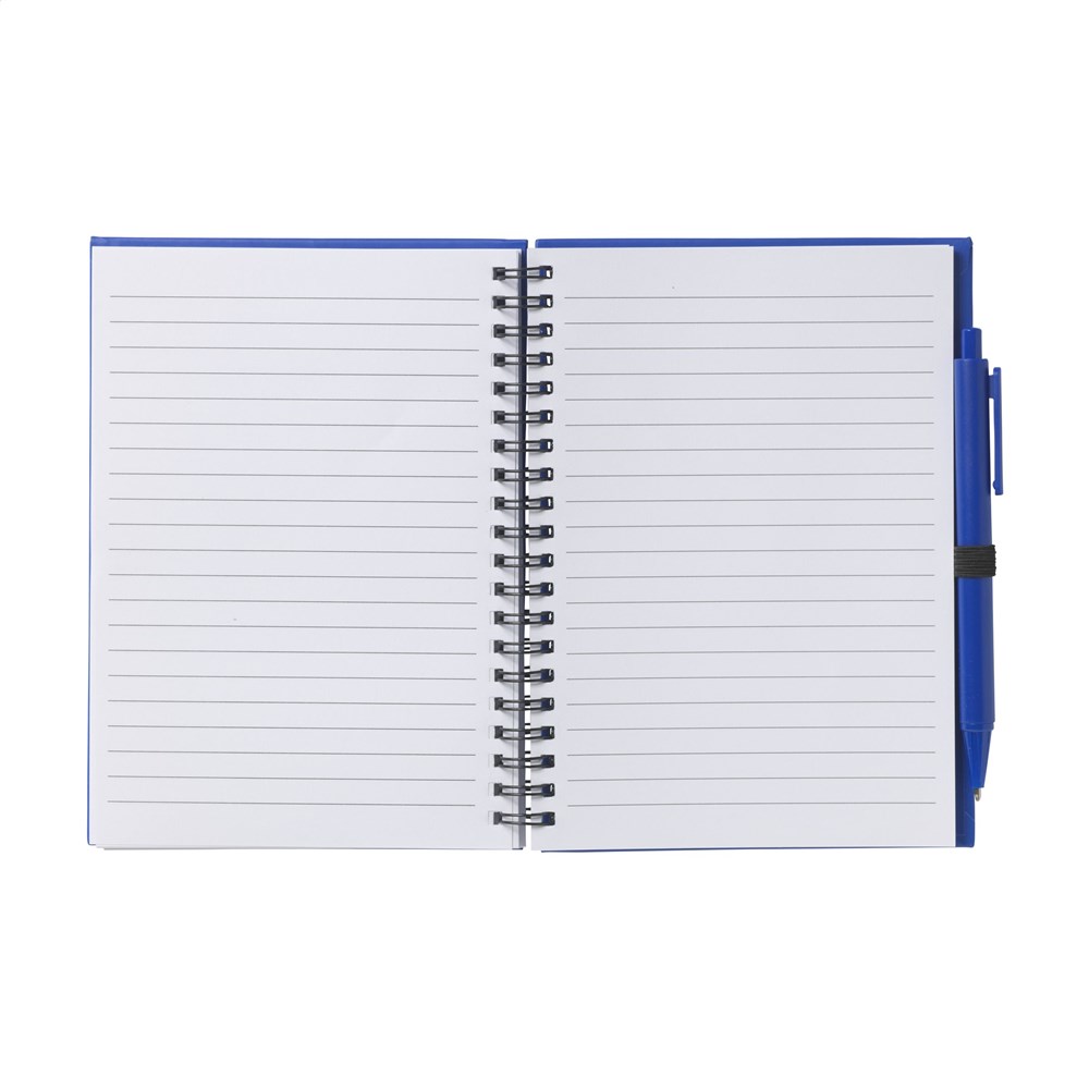 Notitieboekje met ca. 70 vel wit gelinieerd papier en kartonnen, gekleurde omslag. Gebonden in een sterke, metalen wire-o-binding. Incl. bijpassende, blauwschrijvende balpen.