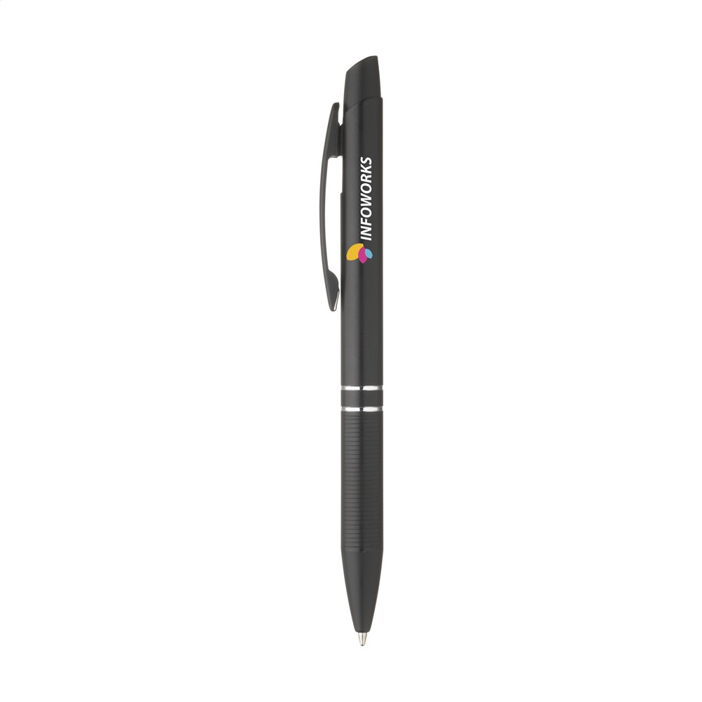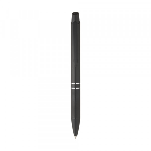 Chique, blauwschrijvende, aluminium balpen met metallic look finish, metalen clip en gripvast voorstuk.