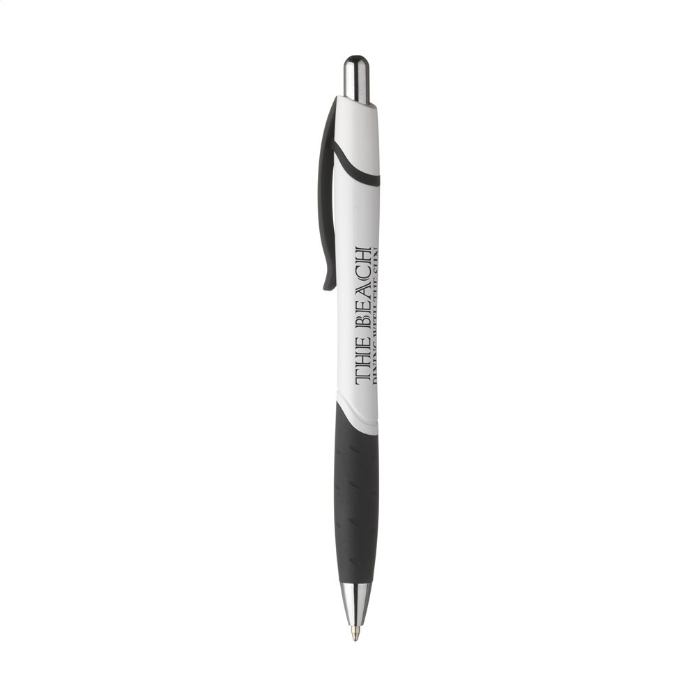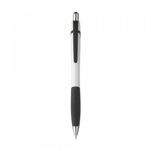 Blauwschrijvende balpen met kleuraccenten, gripvast rubberen voorstuk en elegante clip.