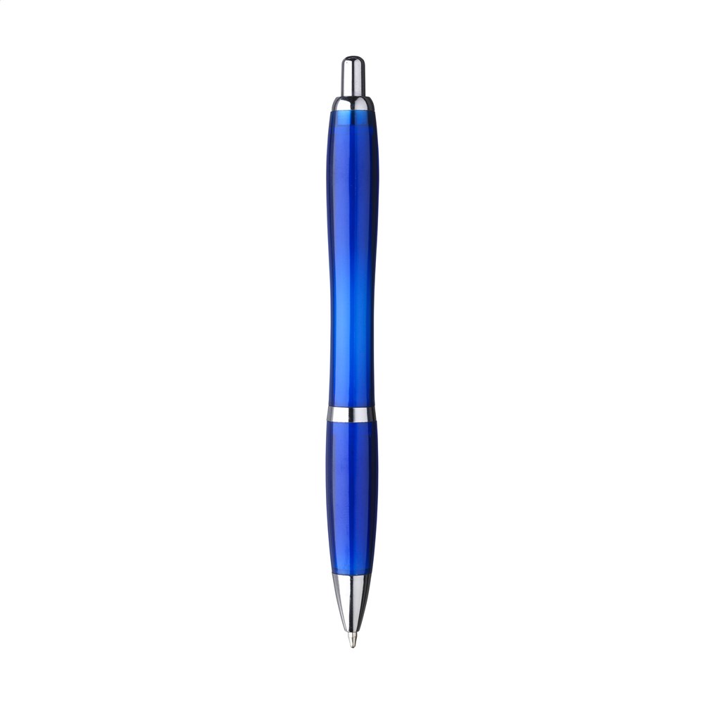 Blauwschrijvende balpen met transparant gekleurde RPET houder; gemaakt van gerecyclede PET-flessen. Met hoogglans accenten en metalen clip. Duurzaam, milieuvriendelijk en ecologisch verantwoord.