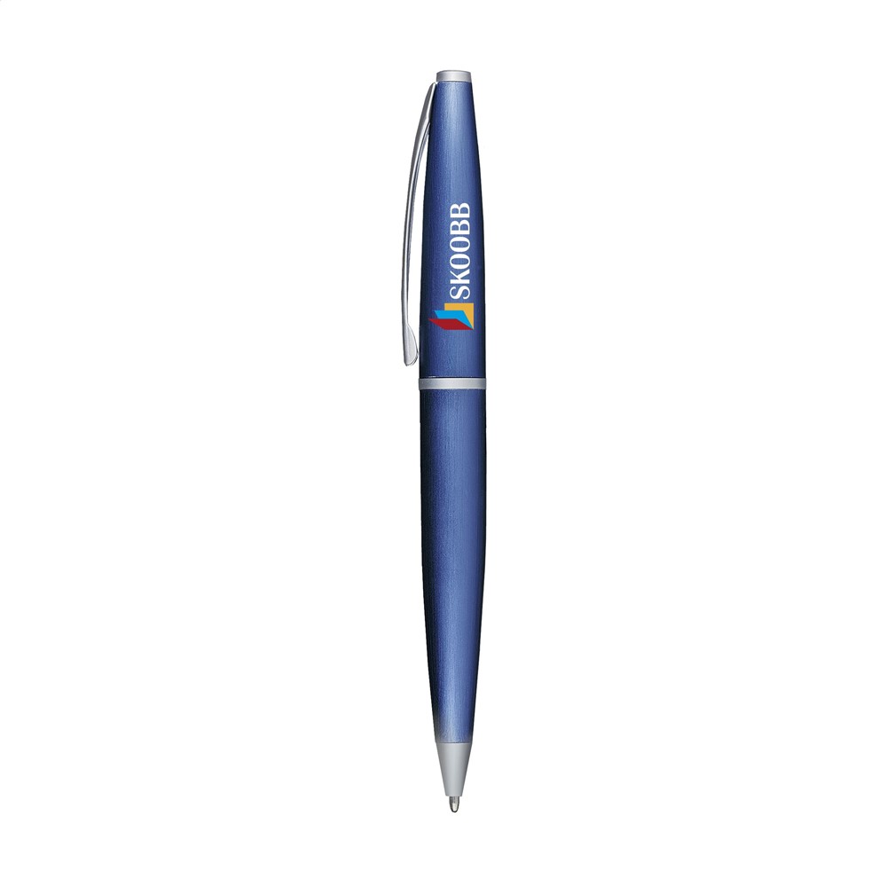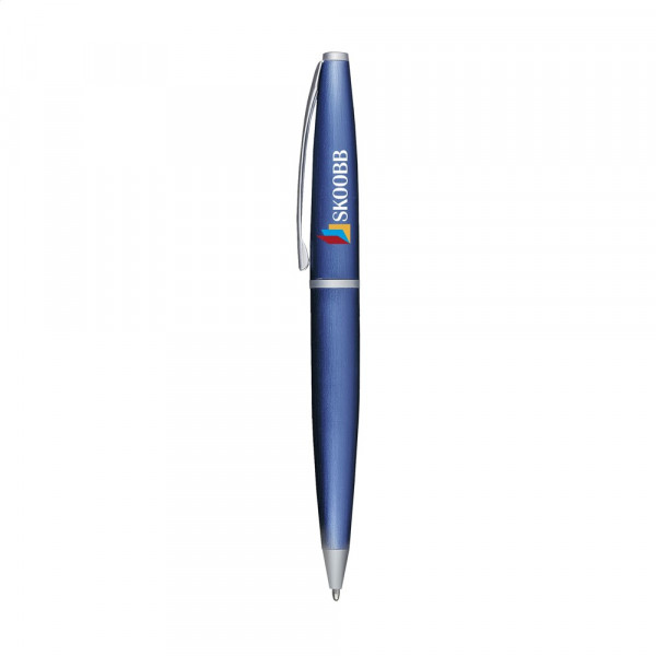 Blauwschrijvende, metalen balpen met matgekleurde houder en draaikliksysteem. Geef je geschenk meer karakter met één van onze stijlvolle geschenkverpakkingen.