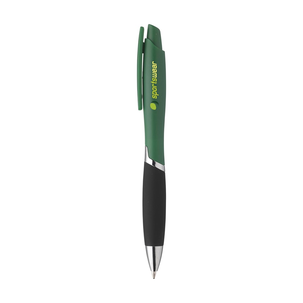 Stijlvolle, blauwschrijvende balpen met gripvast voorstuk, clip/drukknop en zilverkleurige accenten. mehr