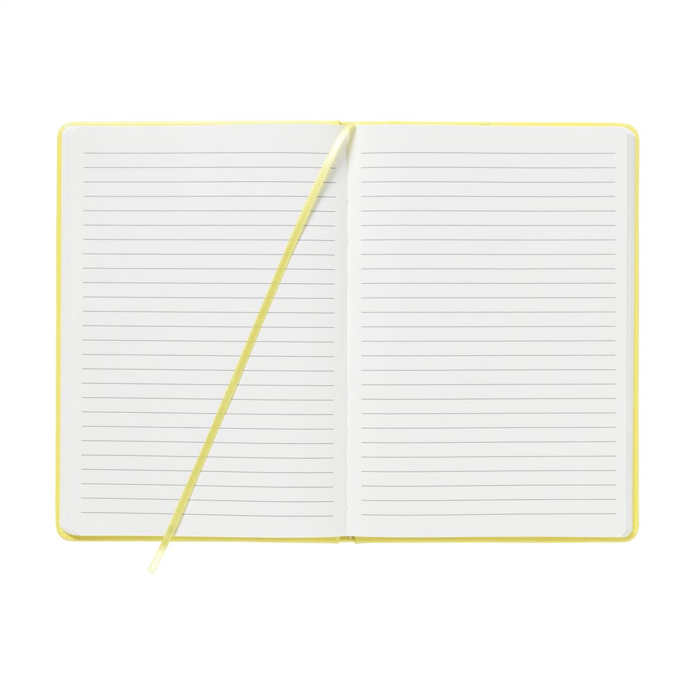 Notitieboek in A5 formaat. Met ca. 80 pagina's 70 grams crèmekleurig, gelinieerd papier. Voorzien van harde kaft in opvallende neonkleur, sluitelastiek, gebonden rug en zijden leeslint. Door de opvallende kleur gemakkelijk terug te vinden in je documententas.
