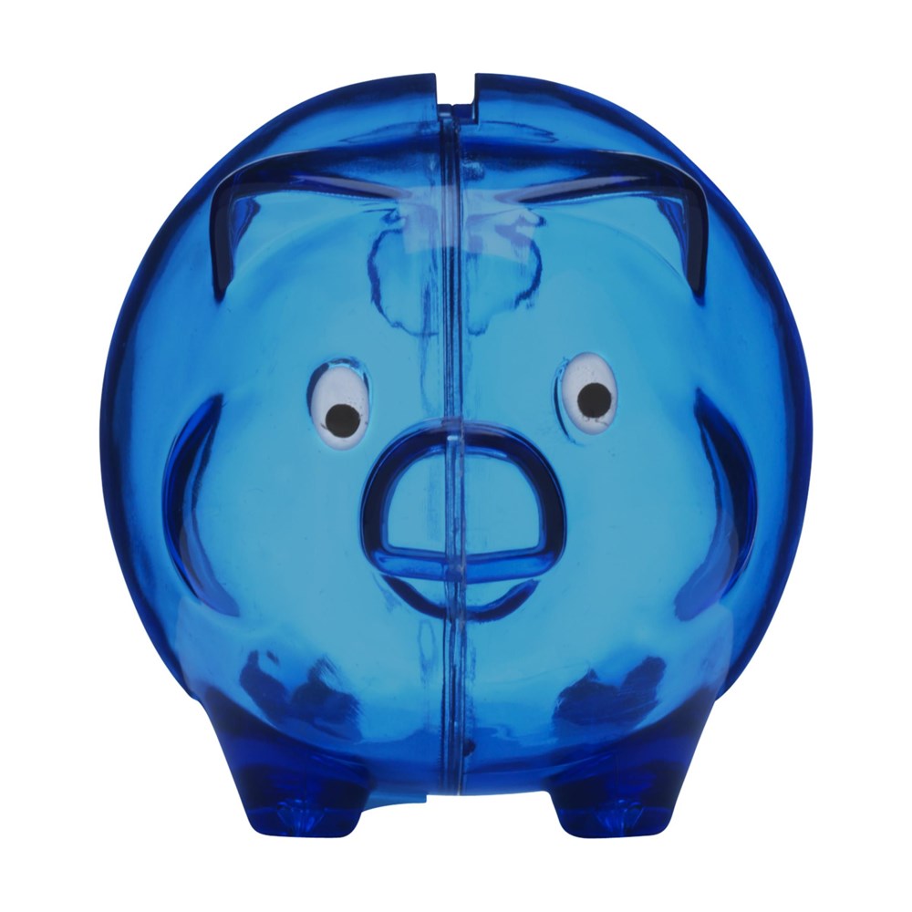 Spaarvarkentje van transparant gekleurd kunststof. Geen afsluitbare opening. Per stuk in doosje.