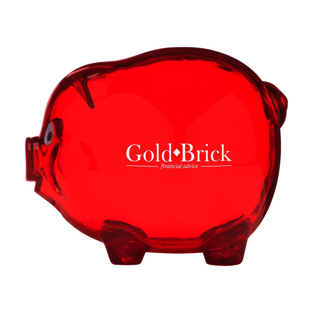 Spaarvarkentje van transparant gekleurd kunststof. Geen afsluitbare opening. Per stuk in doosje.
