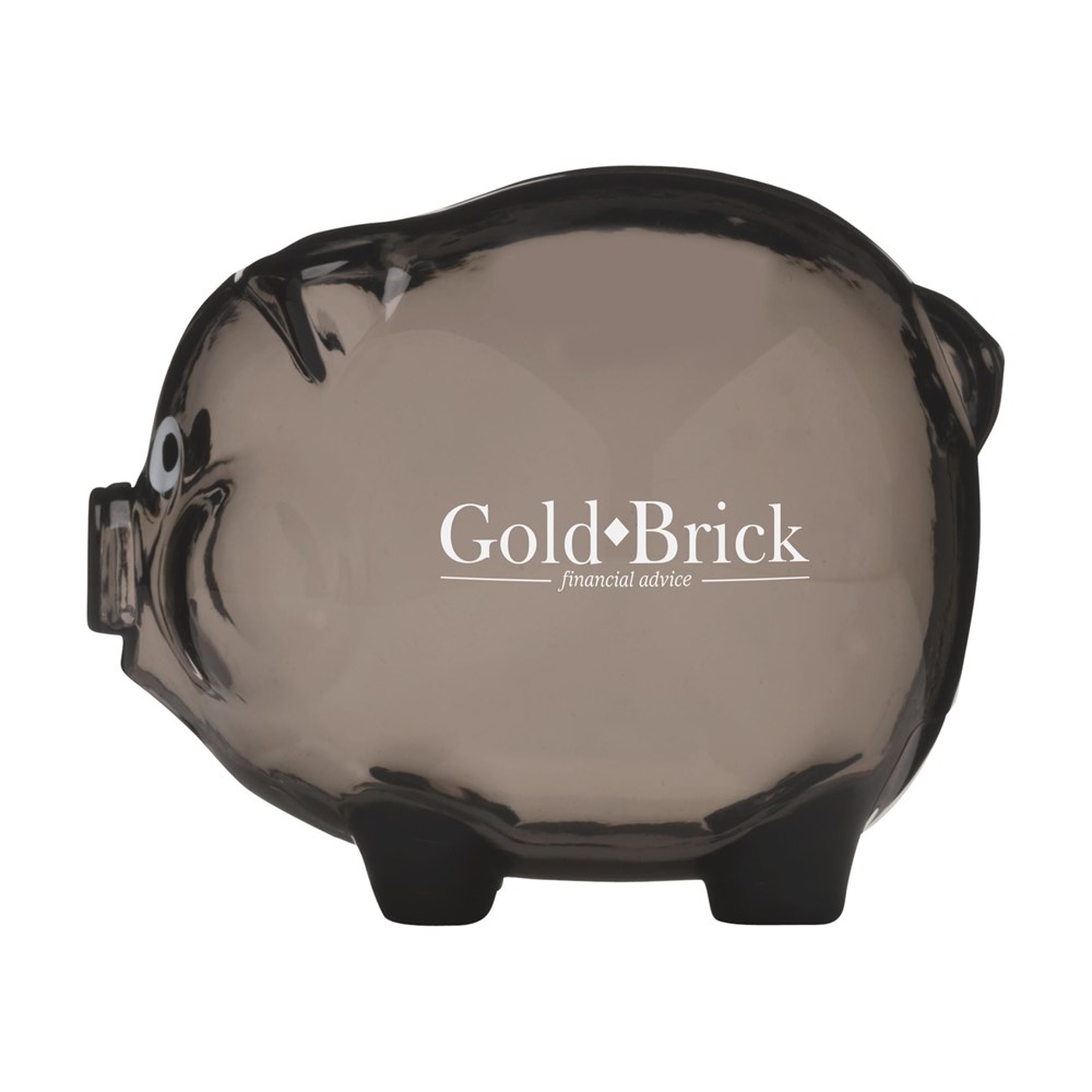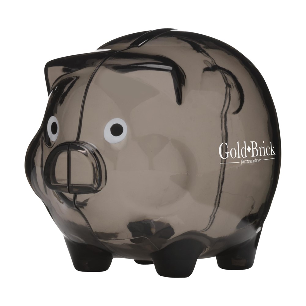 Spaarvarkentje van transparant gekleurd kunststof. Geen afsluitbare opening. Per stuk in doosje.