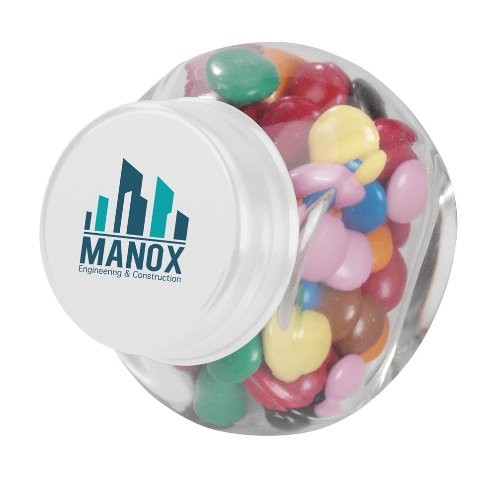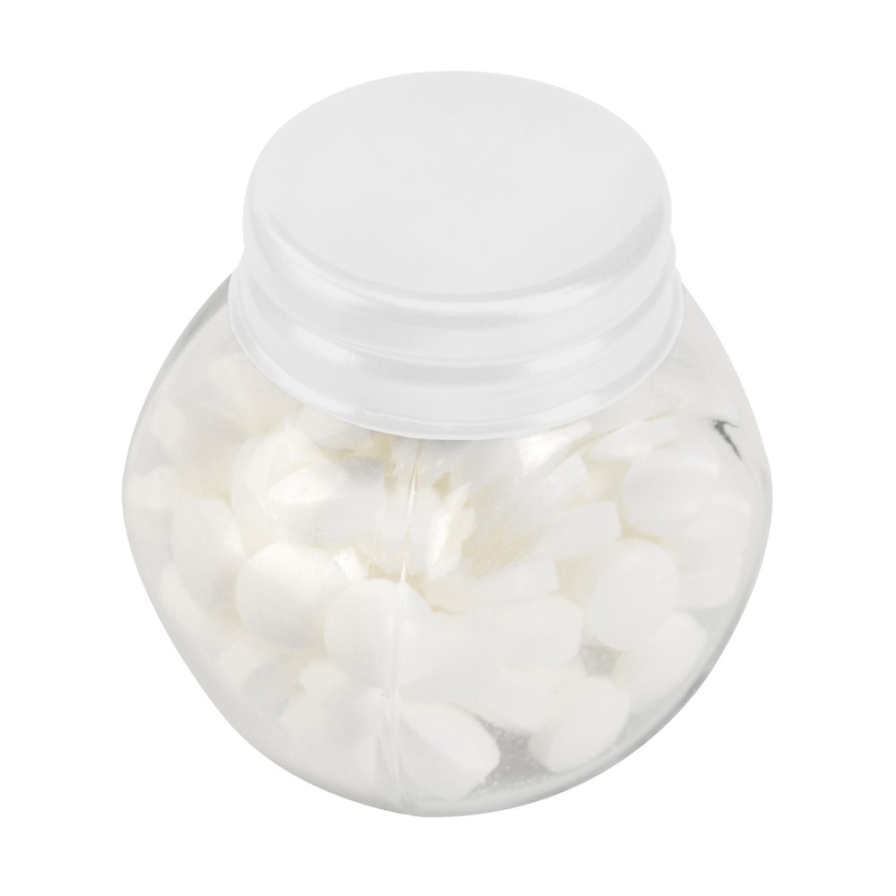 Glazen potje met ca. 30 g snoepjes. Keuze uit pepermunt, chocolade, jellybeans en hartjes.