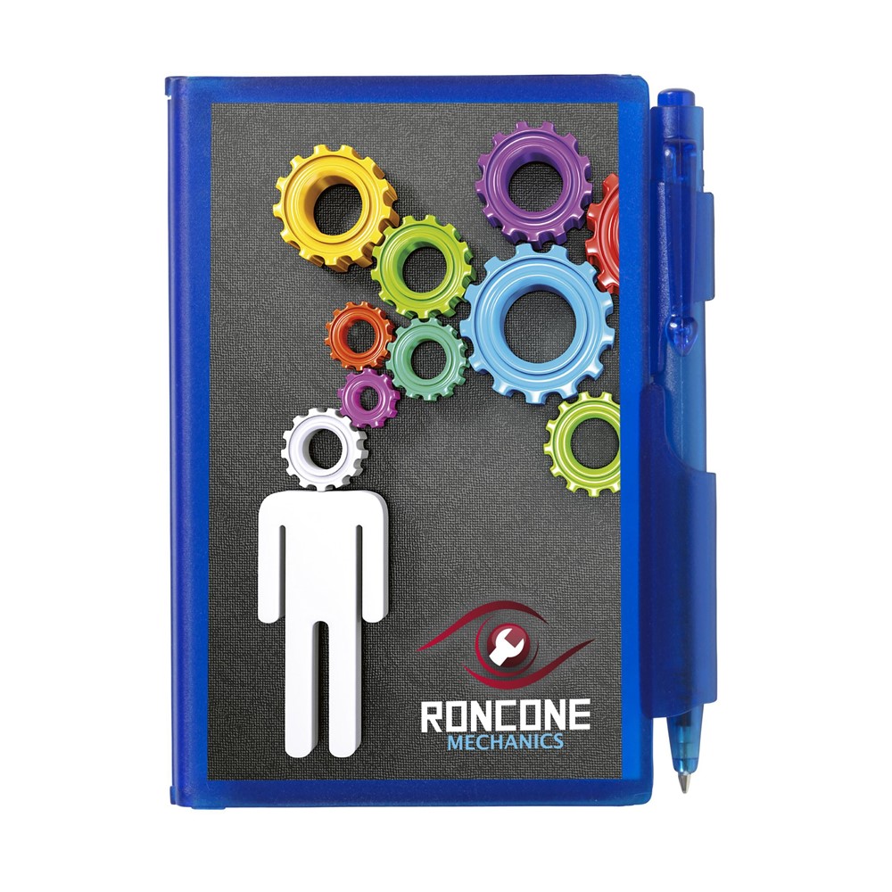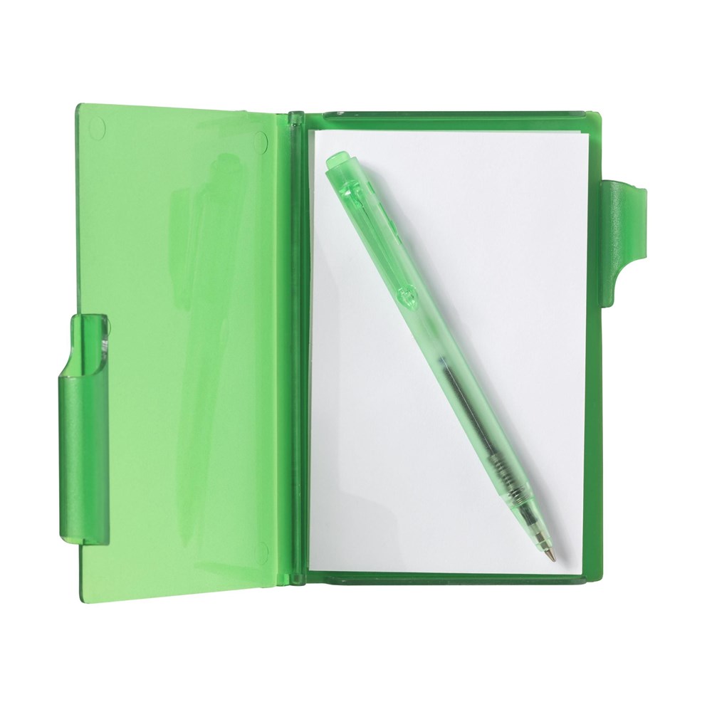 Kunststof memohouder met notitieblokje (60 vel) en blauwschrijvende balpen.