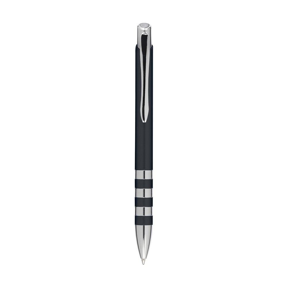 Blauwschrijvende balpen met metallic look houder, metalen clip en drukknop en opvallende tussenringen.