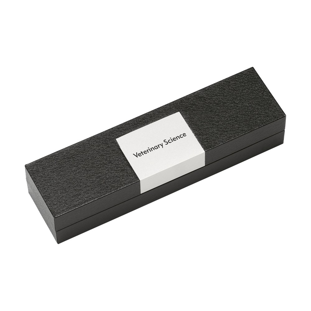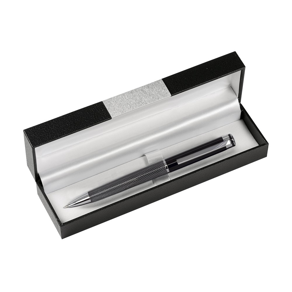 Blauwschrijvende, hoogglans balpen met draaikliksysteem en metalen clip/top, puntstuk en tussenring. In cassette.