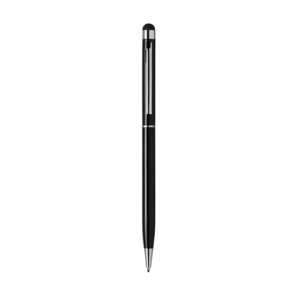 Blauwschrijvende, metalen balpen met rubberen top/pointer voor het bedienen van touchscreens (zoals iPhone/iPad), hoogglans accenten en draaikliksysteem. Geef uw geschenk meer karakter met één van onze stijlvolle geschenkverpakkingen.
