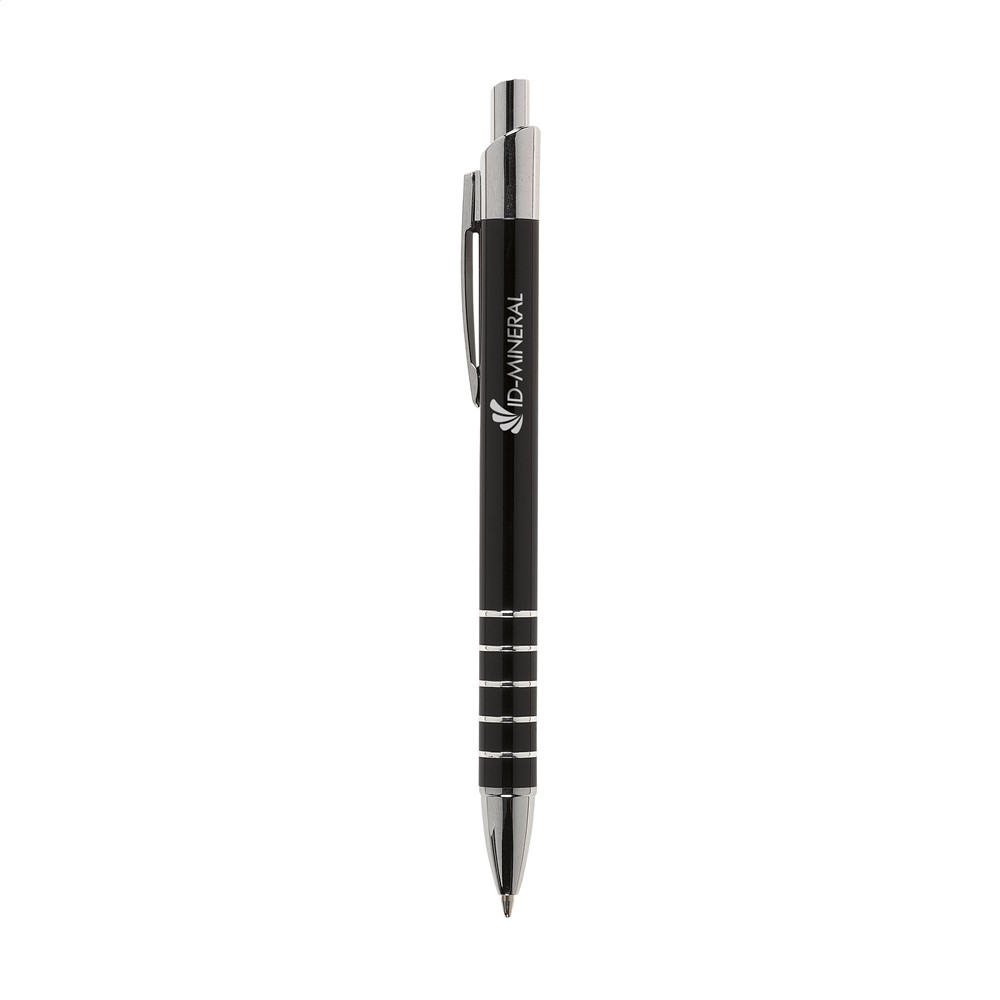 Blauwschrijvende, aluminium balpen in metallic look, met metalen clip en tussenringen. Geef uw geschenk meer karakter met één van onze stijlvolle geschenkverpakkingen.