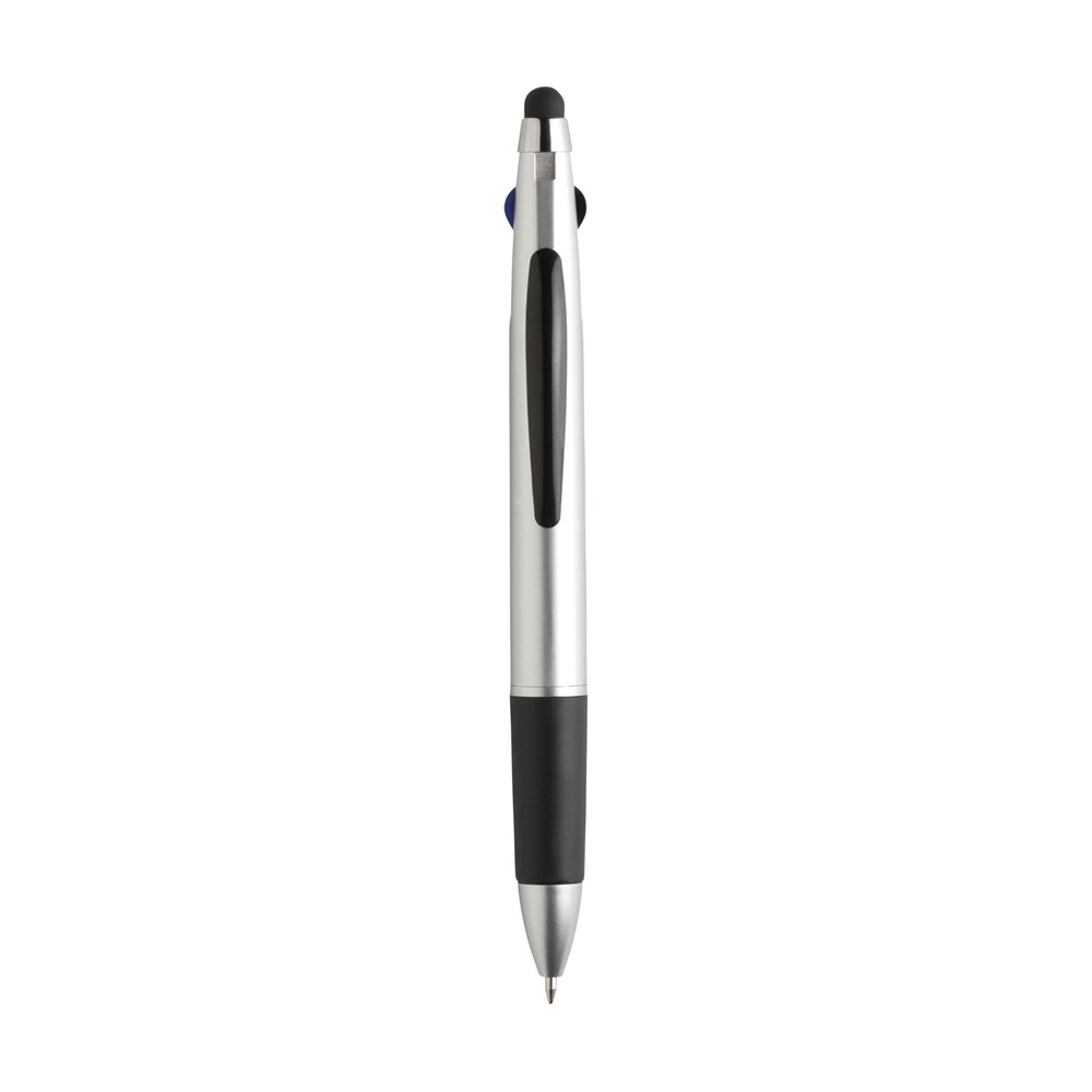 3-kleuren balpen met rubberen top/pointer voor het bedienen van touchscreens (zoals iPhone/iPad), metallic look houder, zilverkleurig accent en rubberen voorstuk. Voorzien van een blauwe, rode en zwarte vulling.