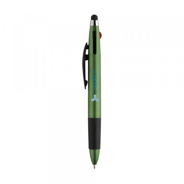 3-kleuren balpen met rubberen top/pointer voor het bedienen van touchscreens (zoals iPhone/iPad), metallic look houder, zilverkleurig accent en rubberen voorstuk. Voorzien van een blauwe, rode en zwarte vulling.