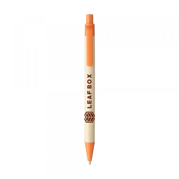 Eco-vriendelijke balpen met houder van gerecycled papier. De gekleurde clip, drukknop en het puntstuk zijn van biologisch afbreekbaar PLA. Met blauwschrijvende vulling.