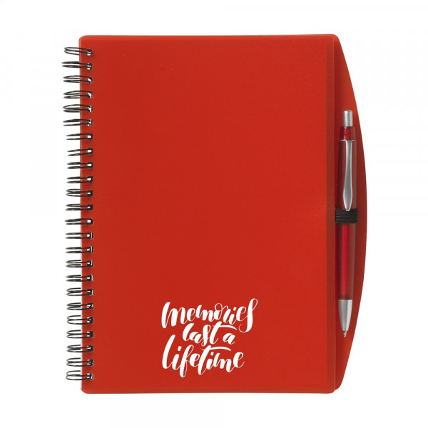 Notitieboek met ca. 70 vel gelinieerd schrijfpapier en transparant kunststof omslag, gebonden in metalen wire-o-binding. Incl. blauwschrijvende balpen.