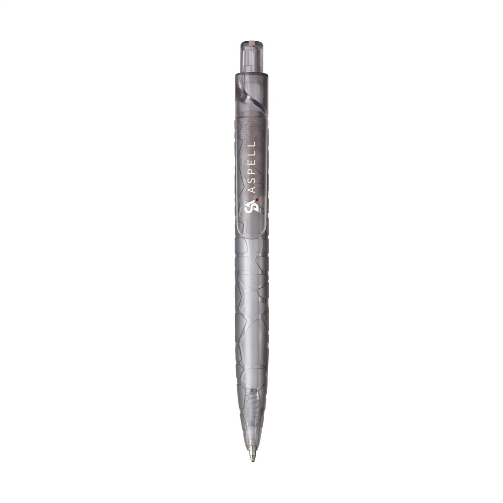 Blauwschrijvende RPET balpen, vrijwel geheel gemaakt van gerecyclede PET-flessen. De houder heeft een opvallend reliëf patroon. De royale clip is uitermate geschikt voor een opdruk en valt direct op.
