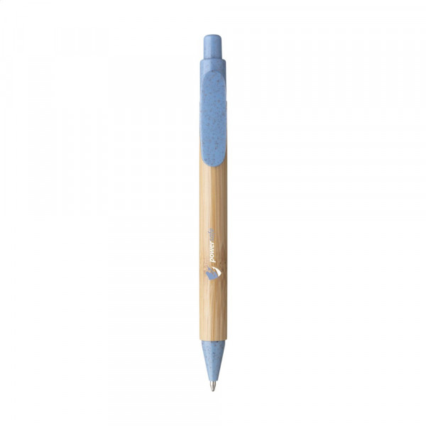 Blauwschrijvende balpen met bamboe houder. De clip, drukknop en het puntstuk zijn van tarwestro. Nagenoeg geheel afbreekbaar. Een ecologische verantwoorde keuze.