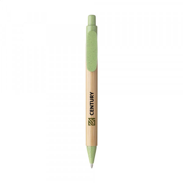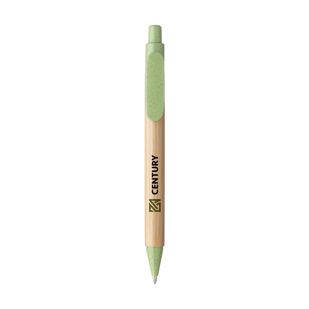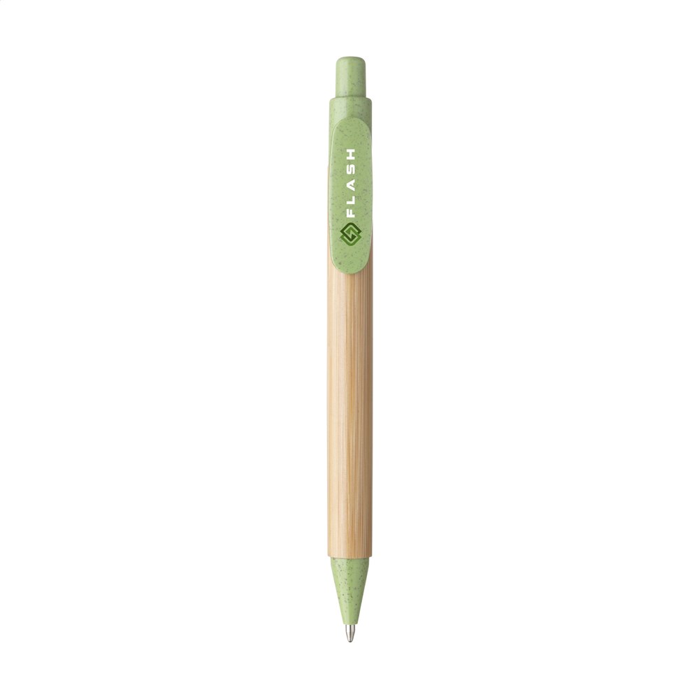 Blauwschrijvende balpen met bamboe houder. De clip, drukknop en het puntstuk zijn van tarwestro. Nagenoeg geheel afbreekbaar. Een ecologische verantwoorde keuze.