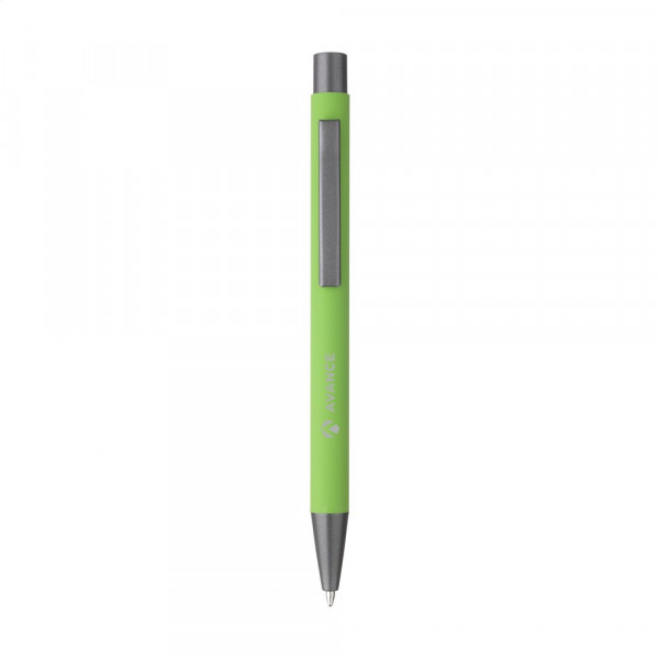Blauwschrijvende, aluminium balpen met rubberized soft touch finish, stevige metalen clip en kunststof puntstuk en drukknop.