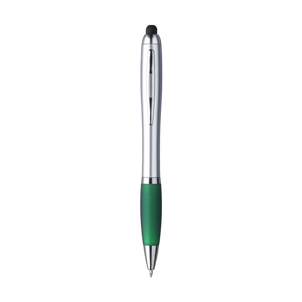 Blauwschrijvende balpen voorzien van een rubberen top/pointer. Met één druk op de pointer wordt het logo in de houder opvallend helder verlicht in een kleur die matcht met de gekleurde, gripvaste houder. Deze pen is perfect voor het bedienen van touchscreens (zoals iPhone/iPad). Met zilverkleurige accenten, een fraaie metalen clip en draaikliksysteem. Inclusief beschermdop.