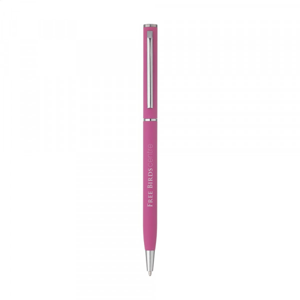 Elegante, blauwschrijvende, aluminium balpen met superslanke houder met rubberized finish, draaikliksysteem en metalen clip, puntstuk, tussenring en top.