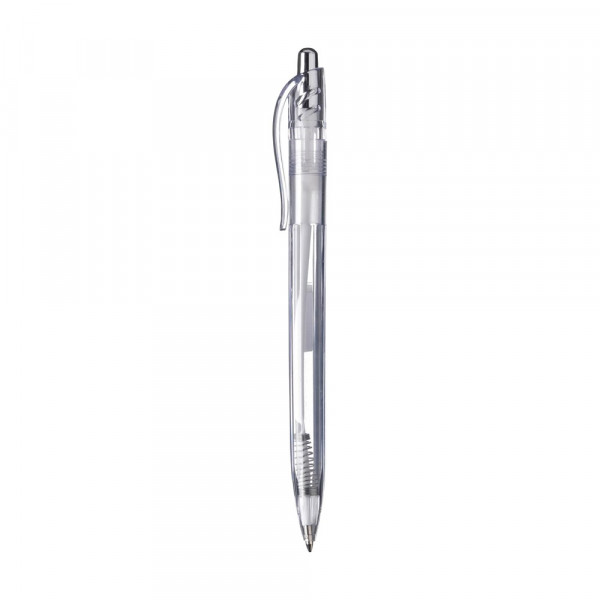 Blauwschrijvende, transparantgekleurde balpen met fraai gebogen clip en zilverkleurige drukknop.