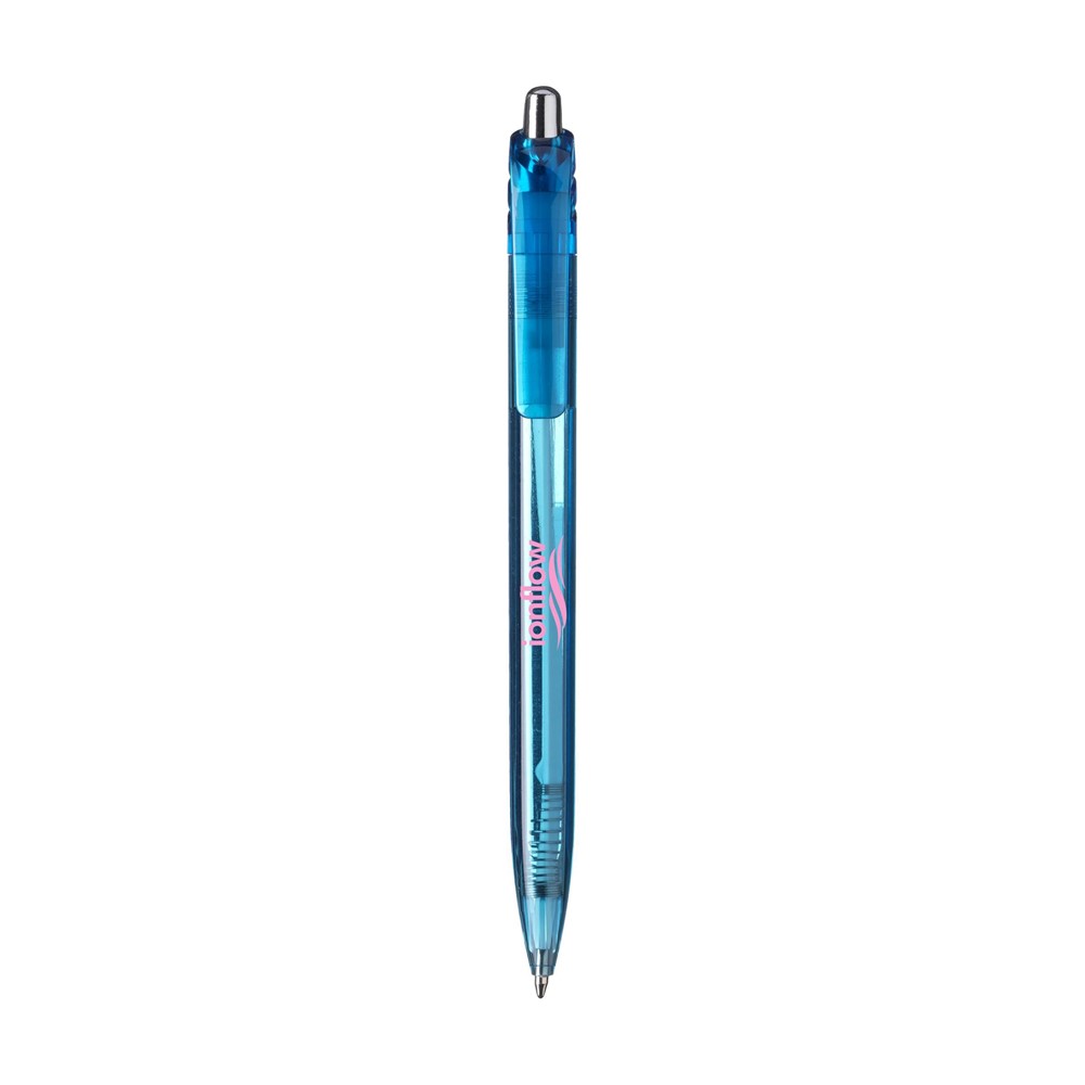 Blauwschrijvende, transparantgekleurde balpen met fraai gebogen clip en zilverkleurige drukknop.