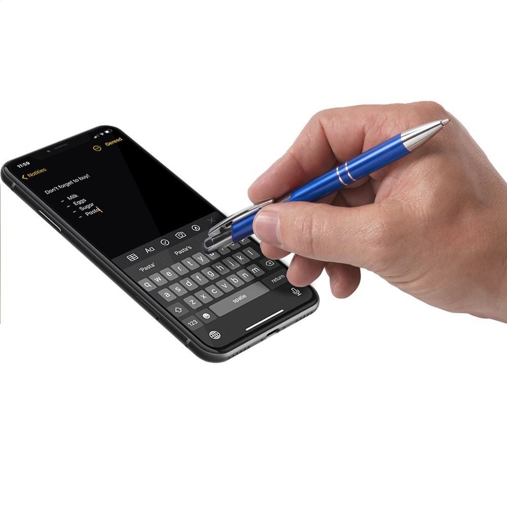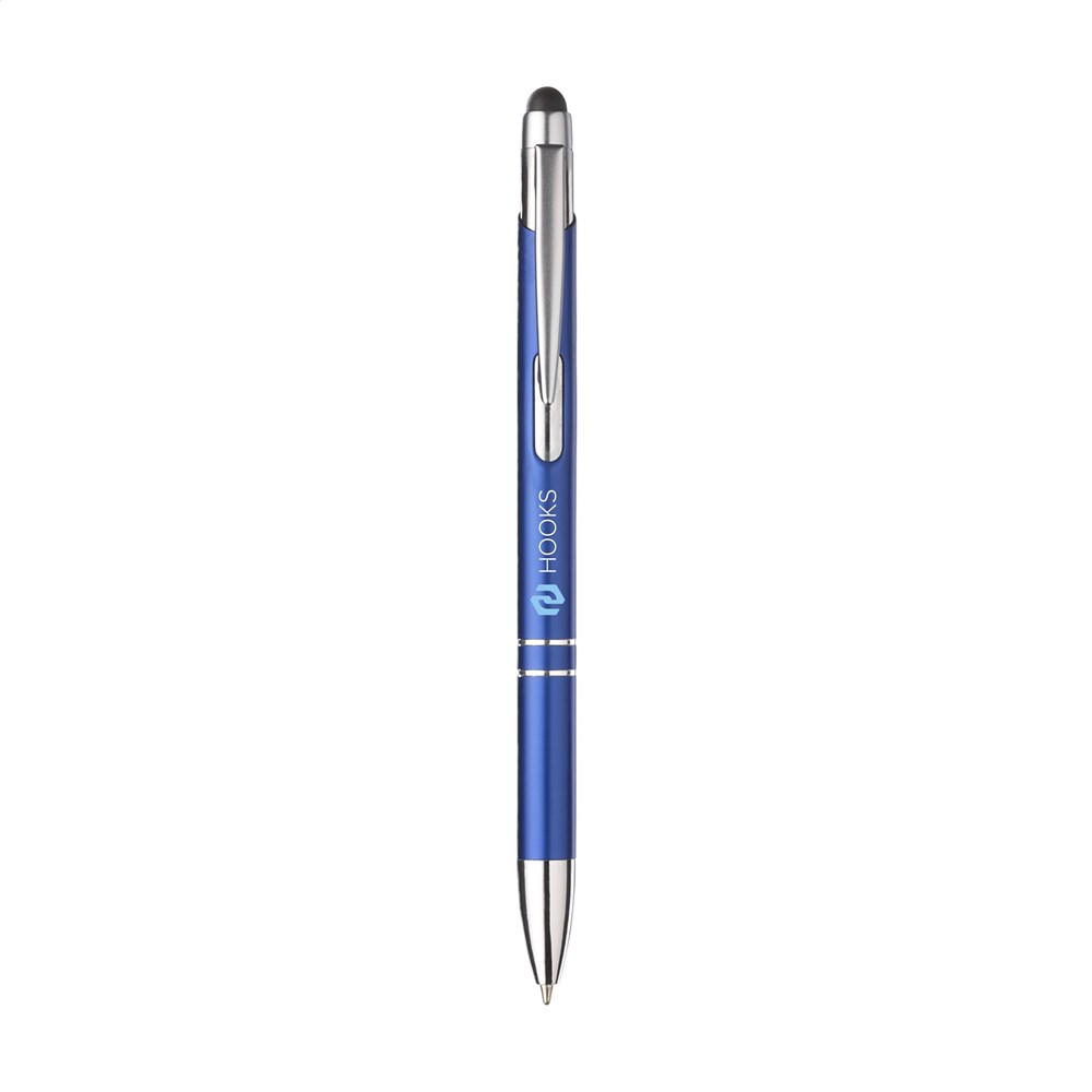 Blauwschrijvende, aluminium balpen. Met top/pointer voor het bedienen van touchscreens (zoals iPhone/iPad), matgekleurde, metalic look houder en metalen clip. Geef je geschenk meer karakter met één van onze stijlvolle geschenkverpakkingen.