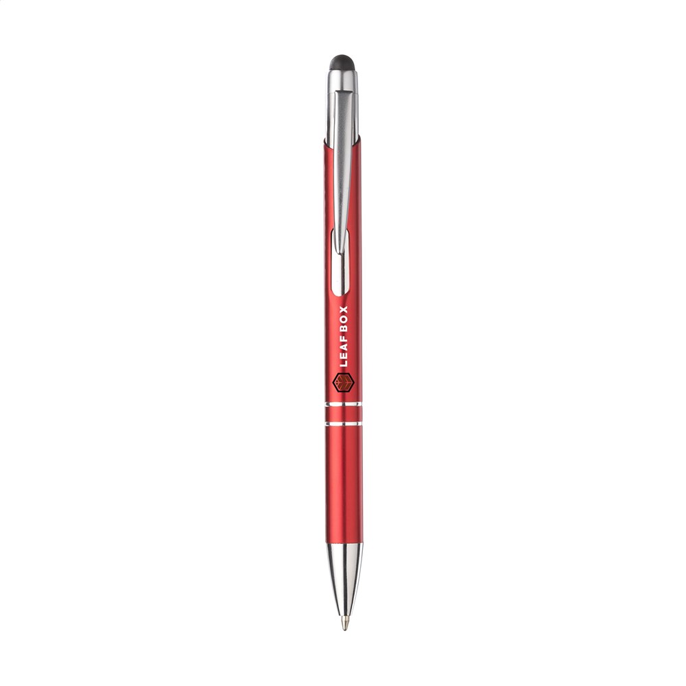 Blauwschrijvende, aluminium balpen. Met top/pointer voor het bedienen van touchscreens (zoals iPhone/iPad), matgekleurde, metalic look houder en metalen clip. Geef je geschenk meer karakter met één van onze stijlvolle geschenkverpakkingen.