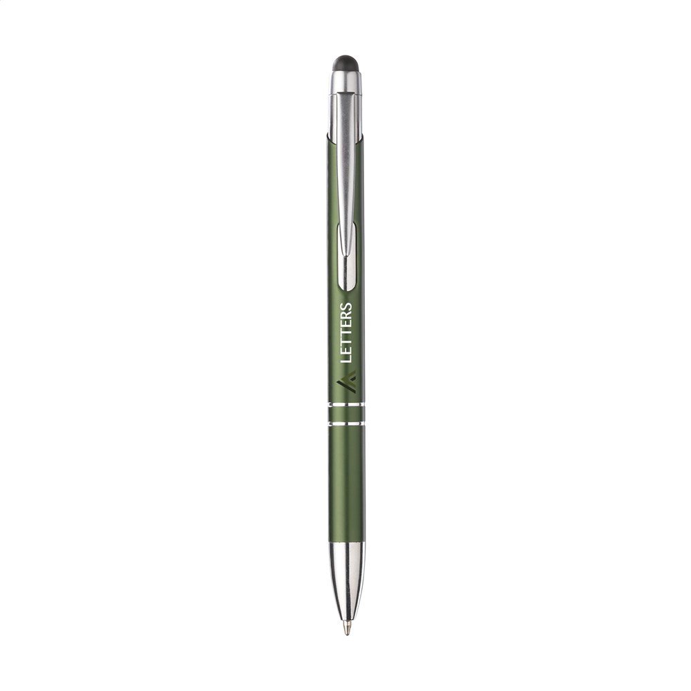 Blauwschrijvende, aluminium balpen. Met top/pointer voor het bedienen van touchscreens (zoals iPhone/iPad), matgekleurde, metalic look houder en metalen clip. Geef je geschenk meer karakter met één van onze stijlvolle geschenkverpakkingen.