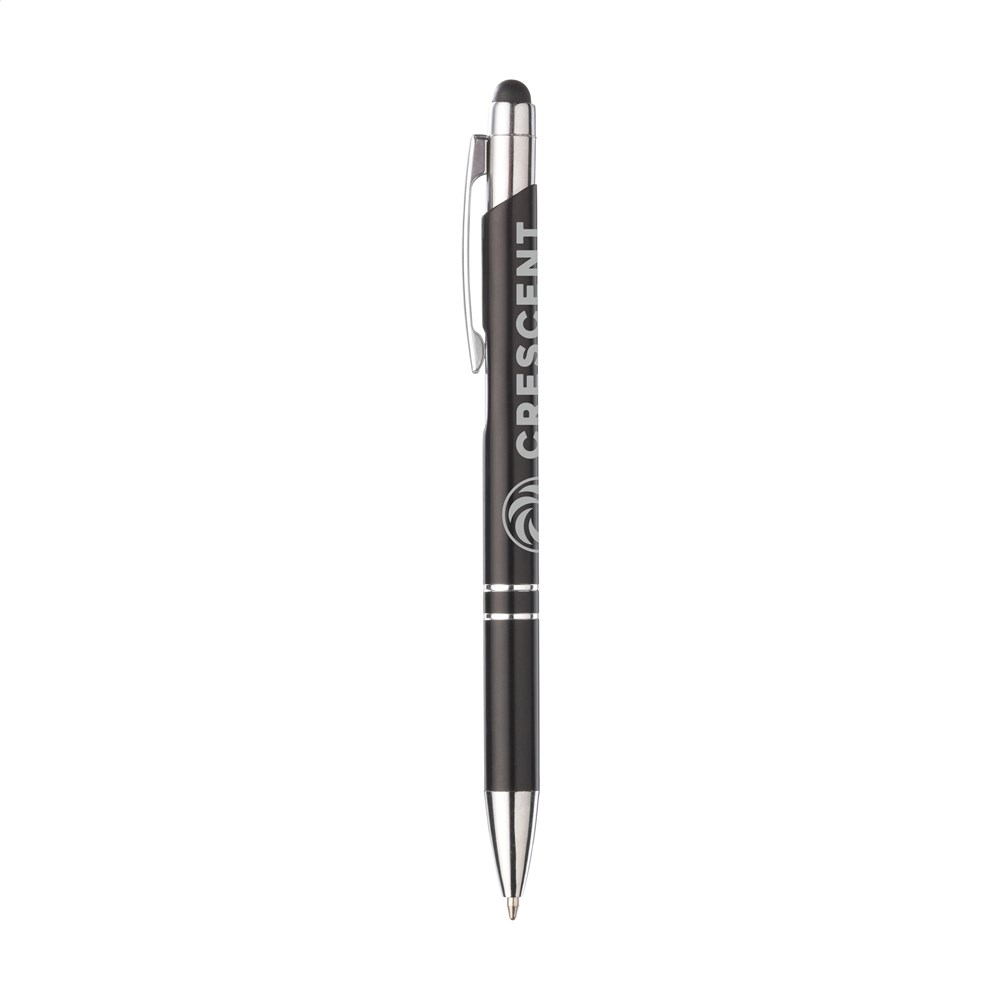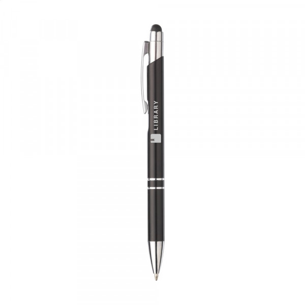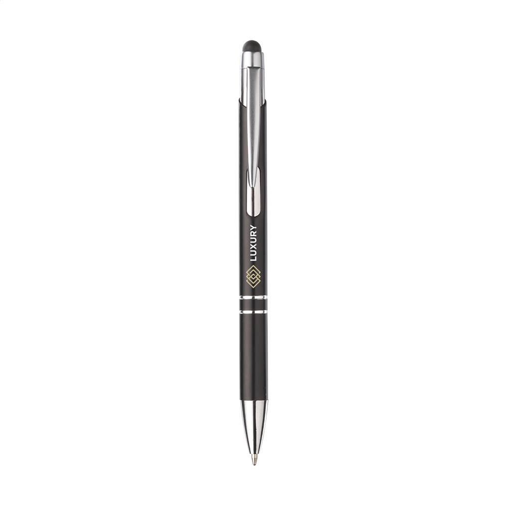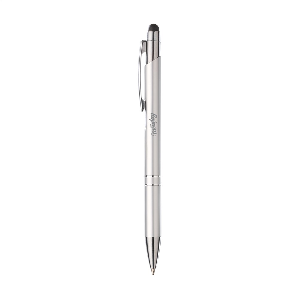 Blauwschrijvende, aluminium balpen. Met top/pointer voor het bedienen van touchscreens (zoals iPhone/iPad), matgekleurde, metalic look houder en metalen clip. Geef je geschenk meer karakter met één van onze stijlvolle geschenkverpakkingen.