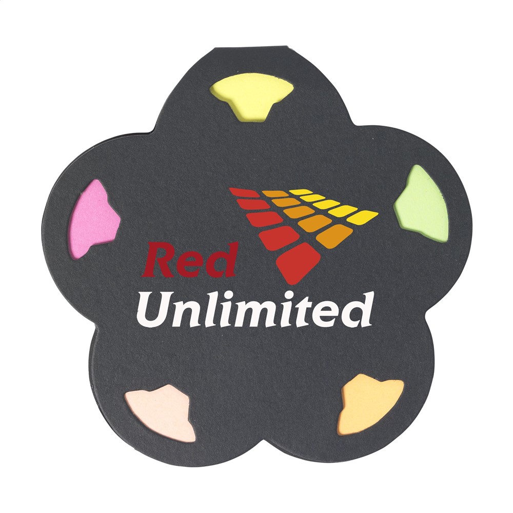 Memoblokje in de vorm van een bloem, met zelfklevende memovelletjes in 5 kleuren. 25 memovelletjes per kleur.